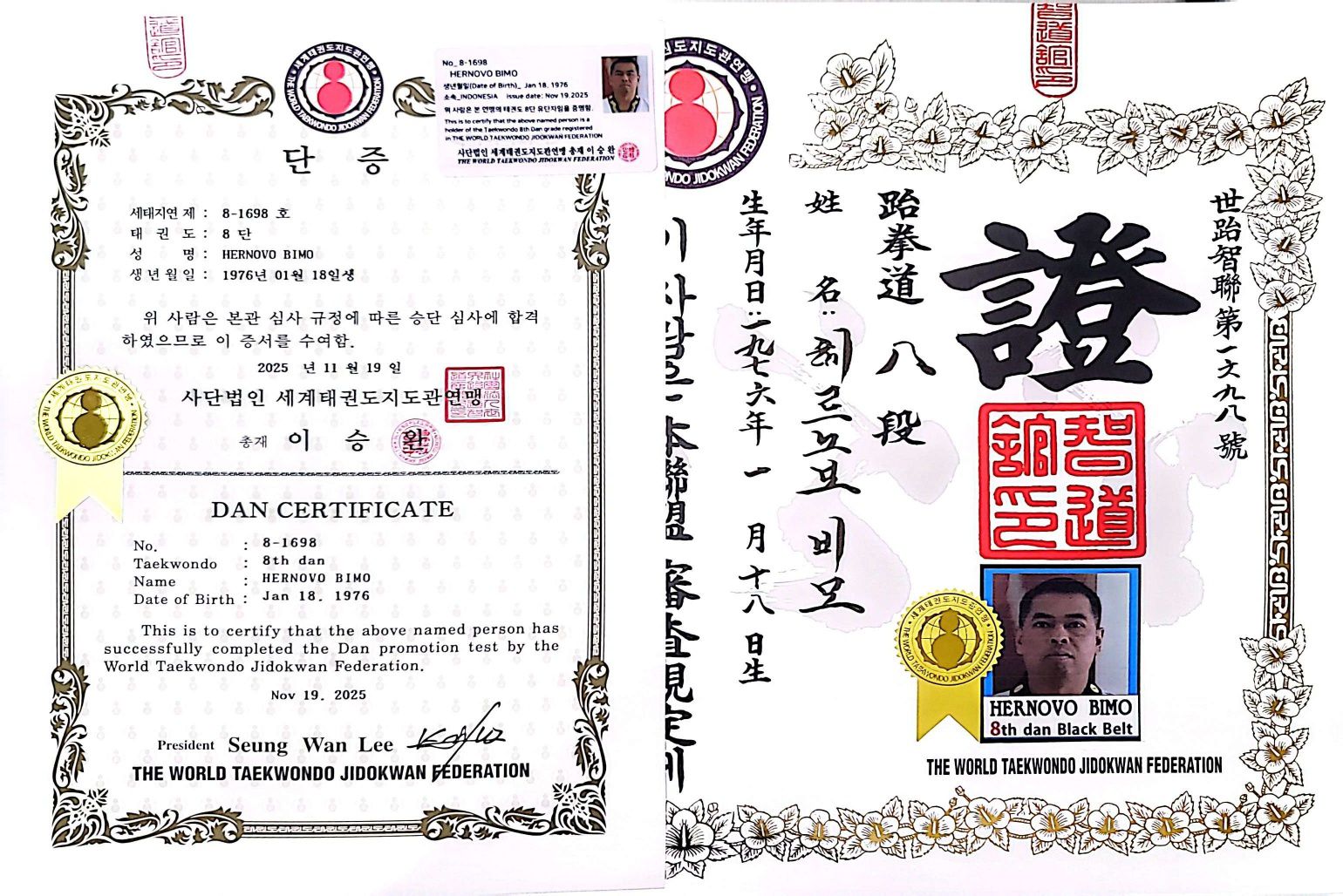 Certificate of Appointments: No: 2023 (12.12.2022) for GM Hernovo from President of The Wold Taekwondo Jidokwan Federation (WTJF)/ Jidokwan Korea GM Lee Sung Wan & Certificate of Appointment Senior Master Hernovo as National President of WTO (World Taekwondo Organization) Indonesia (10.06.2024) by the Pioneers of Taekwondo on the Board of WTO (World Taekwondo Organization) PGM Kong Young IL, PGM Yang Woo Yup, PGM Sang Min Cho, PGM Dong Keun Park, PGM David Daeyun Kim, PGM Yeon Shik Kim, with signatured of Chairman of WTO PGM Kong young IL and President of WTO GM Casey Ilsun Kim. Certificate of Appointment GM Hernovo as Vice President of the World K1-TAEKWONDO by the President of the World K1-TAEKWONDO GM Khan ( 07.08.2024).